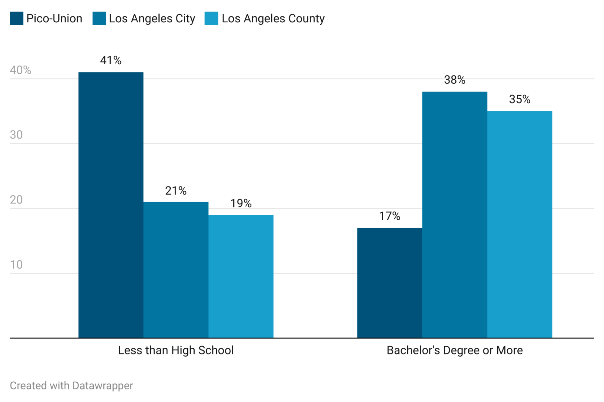 Pico-Union residents have less formal education than the city and county. About 41% of Pico-Union residents did not complete high school, roughly double the share in Los Angeles City (21%) and County (19%). While 38% of city residents and 35% of county residents hold a bachelor’s degree or higher, only 17% of Pico-Union residents have attained that level of education. To CCNP associate executive director Diana Alfaro, these gaps can be attributed somewhat to a lack of formal support for students, such as college preparation and post-secondary planning: