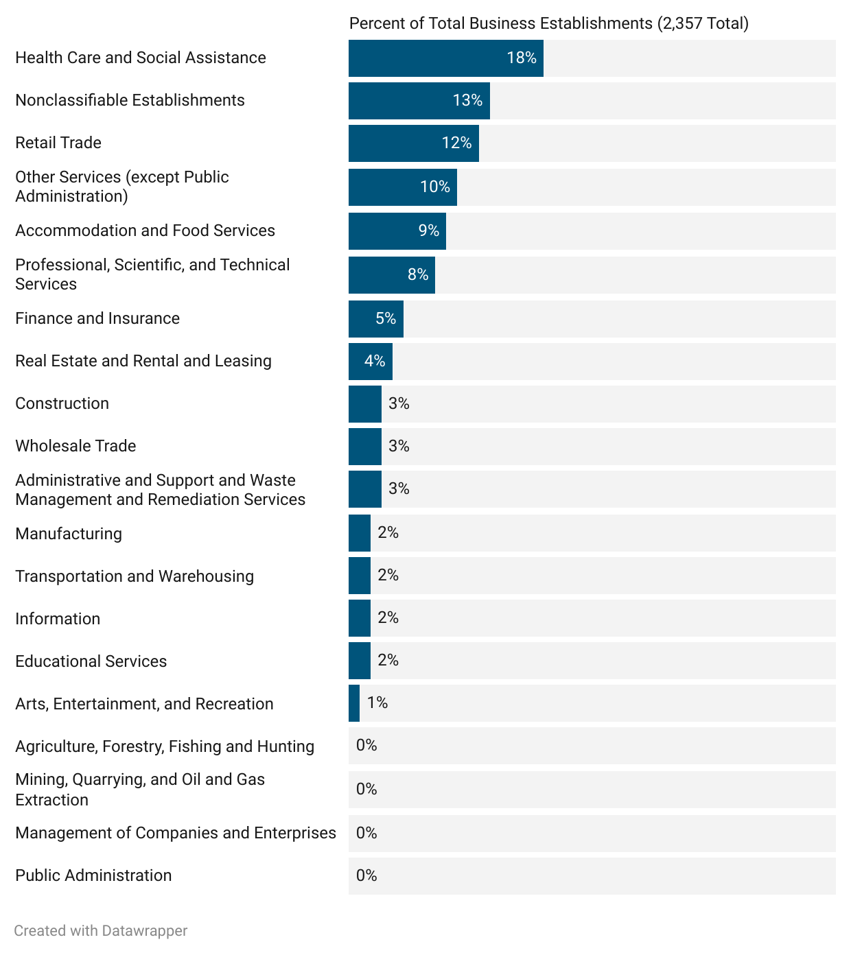 Although no single sector dominates the local business landscape, healthcare and social assistance accounted for nearly a fifth of all establishments (18%). Retail trade (12%) and other services, like dry cleaners, salons, and repair shops, round out the three largest industries in the neighborhood. Ethnic businesses in Pico-Union are primarily small and cater to the immediate needs of residents. Except for one large Latino supermarket, businesses are mostly small to medium-sized retail shops and restaurants, owned and run primarily by Latino, Asian, and Arab immigrants.