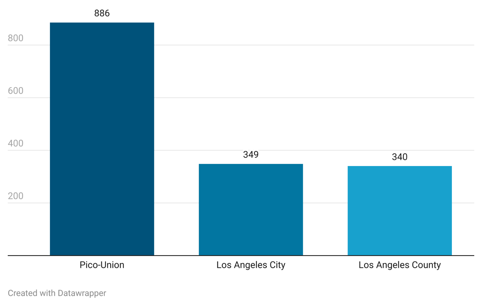 Note: COVID-19 mortality data for the Pico-Union neighborhood is based on neighborhood boundaries defined by the Los Angeles County Department of Public Health. These boundaries may not perfectly align with the geographic boundaries used in this study, but largely overlap.