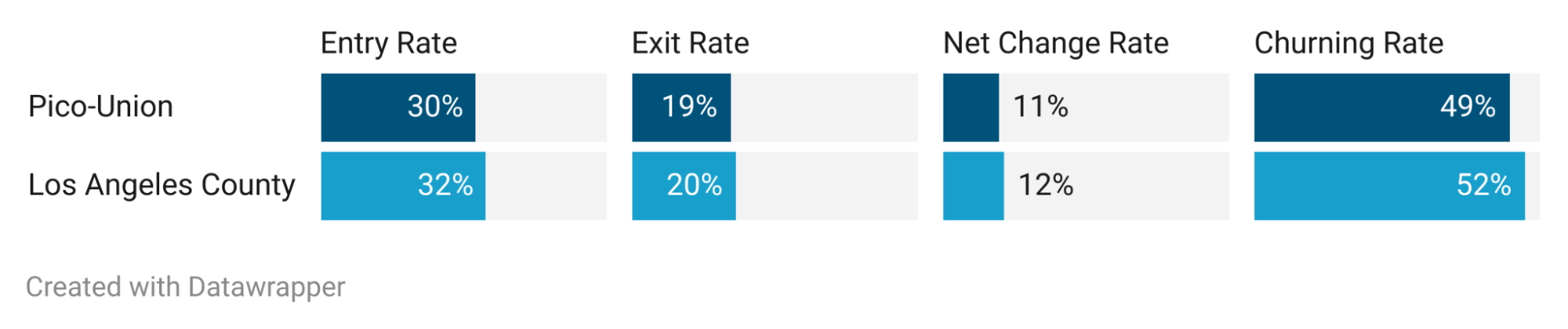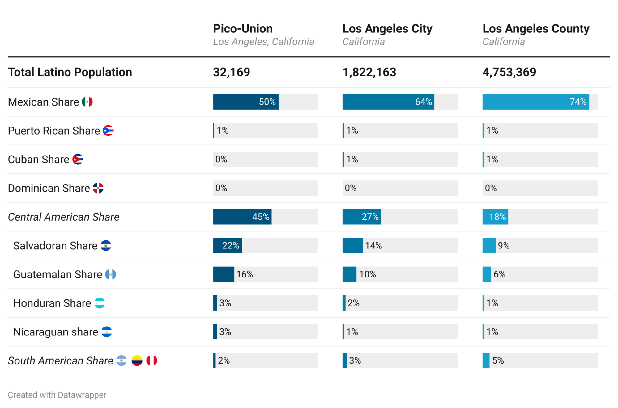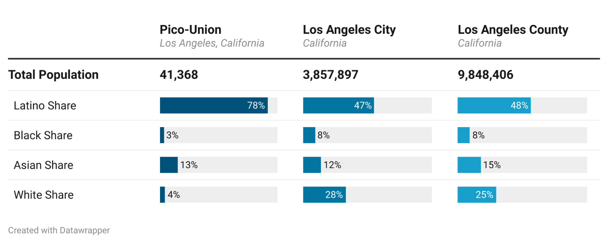 Pico-Union is a predominantly Latino neighborhood, with three out of four residents identifying as Latino (78%; Table 1). This is well above the shares in Los Angeles City (47%) and County (48%) as a whole. Pico-Union also boasts an Asian population share roughly in line with city and county levels (13% compared to 12% and 15% respectively), most of whom are of Korean descent.19