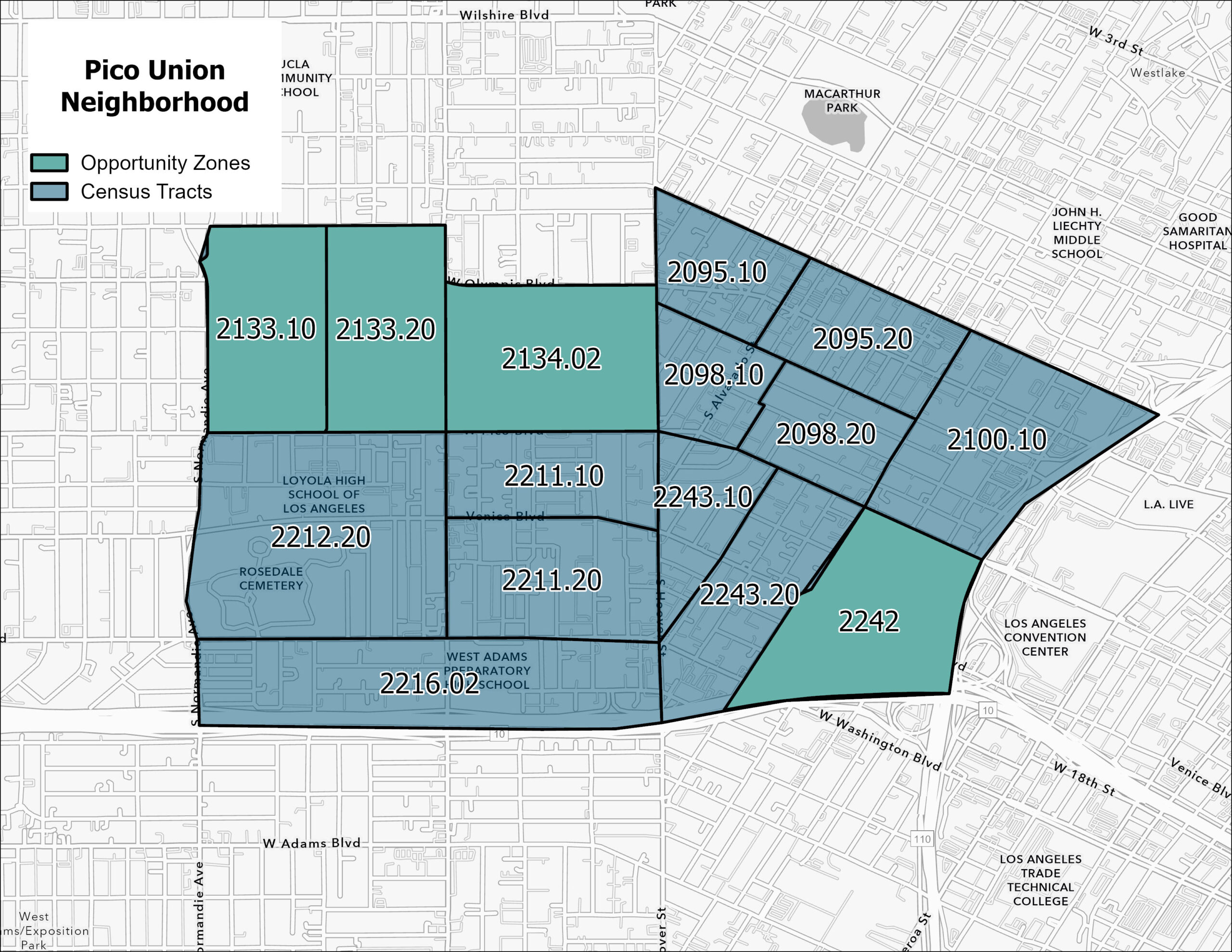 The Pico-Union study area spans multiple census tracts outlined in red. Only four of these—2133.10, 2133.20, 2134.02, and 2242—are designated as federal Opportunity Zones (shaded in green). An Opportunity Zone is a federally designated area where investors receive tax incentives for putting money into local businesses or development projects. For neighborhoods like Pico-Union, this designation can attract much-needed private investment to support housing, job creation, and infrastructure improvements.47 Though the benefits depend on whether those investments genuinely serve existing residents rather than accelerating displacement.