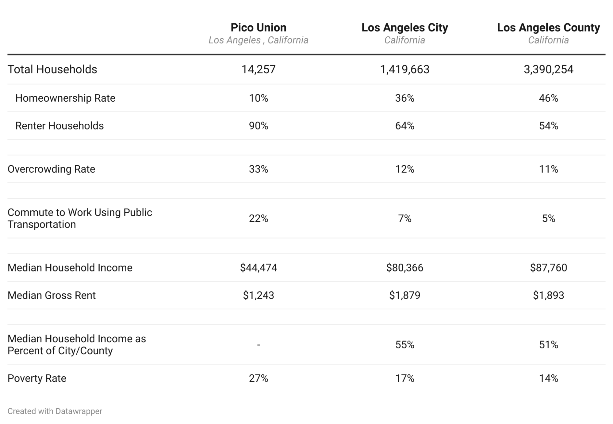 Pico-Union is a majority-Latino, working-class community marked by persistent housing and income disparities compared to the greater city and county. For example, Pico-Union households earn substantially lower median incomes ($44,500; see Table 4) than the city ($80,400) and county ($87,800). Median household incomes in Pico-Union are only 64% of the city median, and 54% of the county median, highlighting the significant income gaps compared to the broader region. While the median gross rent in Pico-Union ($1,200) is lower than in the city ($1,900) and county overall ($1,900), it remains high relative to local incomes and is inaccessible to many.