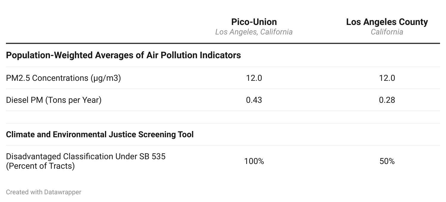 Due to elevated air pollution levels and other environmental burdens, Pico-Union has been designated as a disadvantaged area under SB 535, which targets specific communities in California for climate-related investments.30 All census tracts in the study area are designated as disadvantaged under SB 535, while only half of the Los Angeles County census tracts are considered disadvantaged.