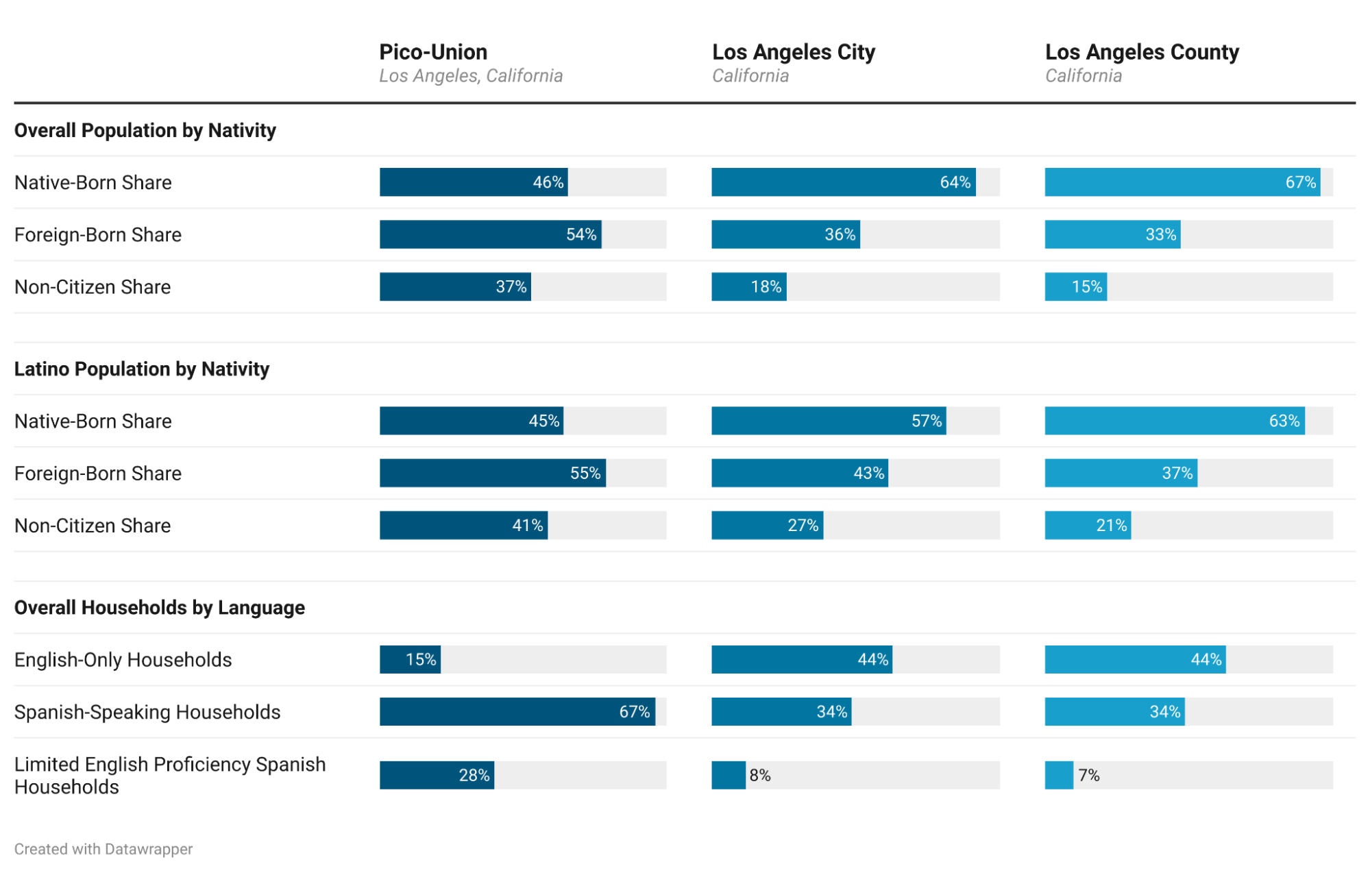 - Deep economic vulnerability in an immigrant-majority community: Pico-Union is a predominantly immigrant neighborhood, with over half of residents born outside the U.S. (54%) and more than one third identifying as noncitizens (37%), more than double the city and county shares. Median household income is just $44,500, only 64% of the city median and 54% of the county median.